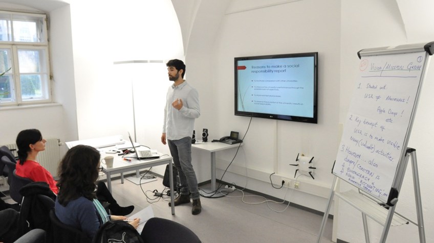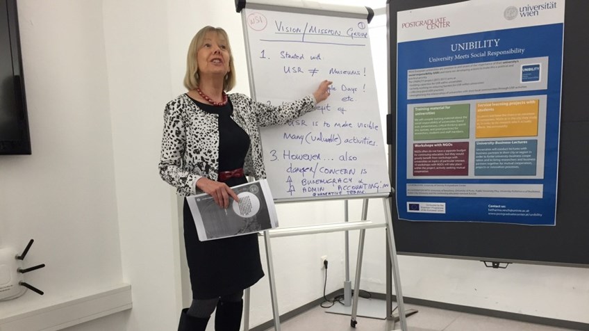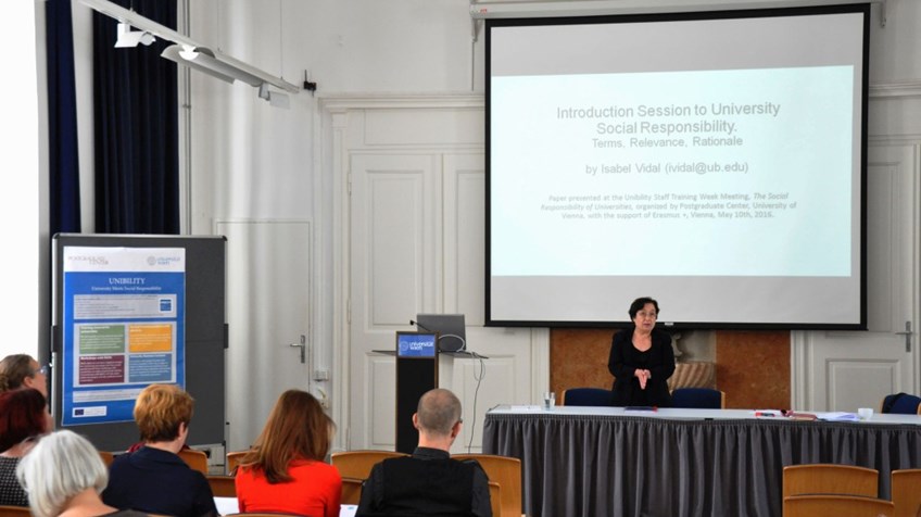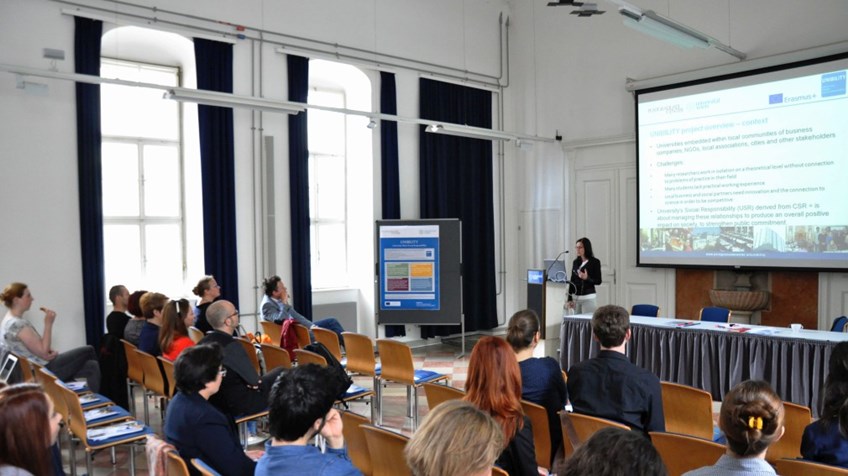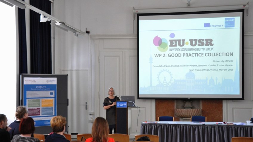 From May 9th to May 13th, 2016, the UNIBILITY partners delivered the joint Staff Training for staff members from marketing, organizational development, management or social projects of the participating universities. In total, 33 people from Austria, Spain, Portugal, Ireland, Romania and Slovenia registered for the training. The training week was hosted by the University of Vienna, Postgraduate Center, Austria. The five-day training involved both input about social responsibility in the university context as well as practical analysis of good practice examples how universities can manage their social responsibility policies and how they can have an impact on local businesses, the community and society as a whole.