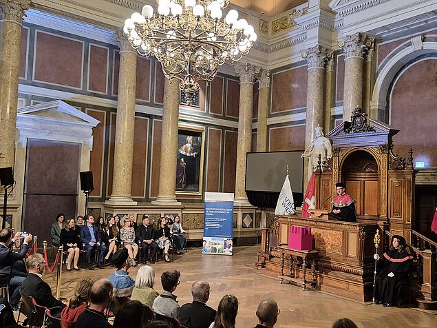 Im Anschluss an die Zeremonie lud ein Sektempfang dazu ein, den Erfolg gemeinsam zu feiern. Absolvent*innen, Lehrende und Gäste nutzten die Gelegenheit für einen entspannten Austausch und ließen den Abend in angenehmer Atmosphäre ausklingen.