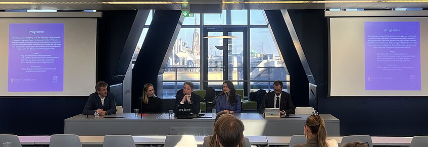 Die Veranstaltung "Law on Air: Legal Podcasting in Praxis & Lehre" fand am 9. April 2026 im Dachgeschoß des Juridicums statt. Žiga Škorjanc vom Institut für Innovation und Digitalisierung im Recht diskutierte mit Dora Bertrandt (Paragraphinnen), Nikolaus Forgó (Universität Wien), Theresa Kamp (Law & Beyond) und Bernd Simon (Knowledge Markets). Die Veranstaltung wurde gemeinsam mit dem Juristenverband ausgerichtet.