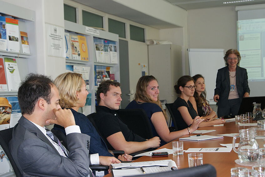 At the beginning of the day, a guided tour through the VIC familiarized us with the purpose and history of the VIC . The first main meeting took place at the UNIDO premises (specialized UN agency promoting three main areas: poverty reduction through productive activities, trade capacity-building, energy and environment) where we particiapted in a workshop with Dr. Behrouz Moradi, the legal adviser and head of office of legal affairs, and Mr. Marco Lau Dan, a main legal officer in his department. The whole morning consisted of a presentation of UNIDO’s legal framework complemented by a case study and followed by a vivid debate. We were given an in-depth insight into UNIDO‘s daily legal work, and discussed questions such as: How are staff disputes settled within the UNIDO? Does UNIDO have internal responses to potential corruption ? Is UNIDO affected by UN Security Council economic sanctions? The LLM students appreciated the adequate time management of this tour enabling sufficient place for discussions.