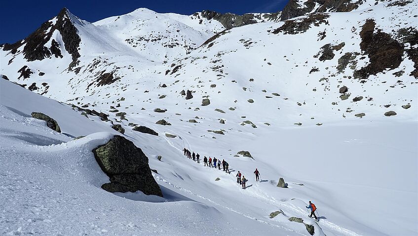 Im Rahmen der Lehrveranstaltung "Risikokommunikation" erkundeten die Studierenden des Weiterbildungsprogramms "Risikoprävention und Katastrophenmanagement" von 30. März bis 1. April 2022 das Gelände im winterlichen Kühtai in Tirol.