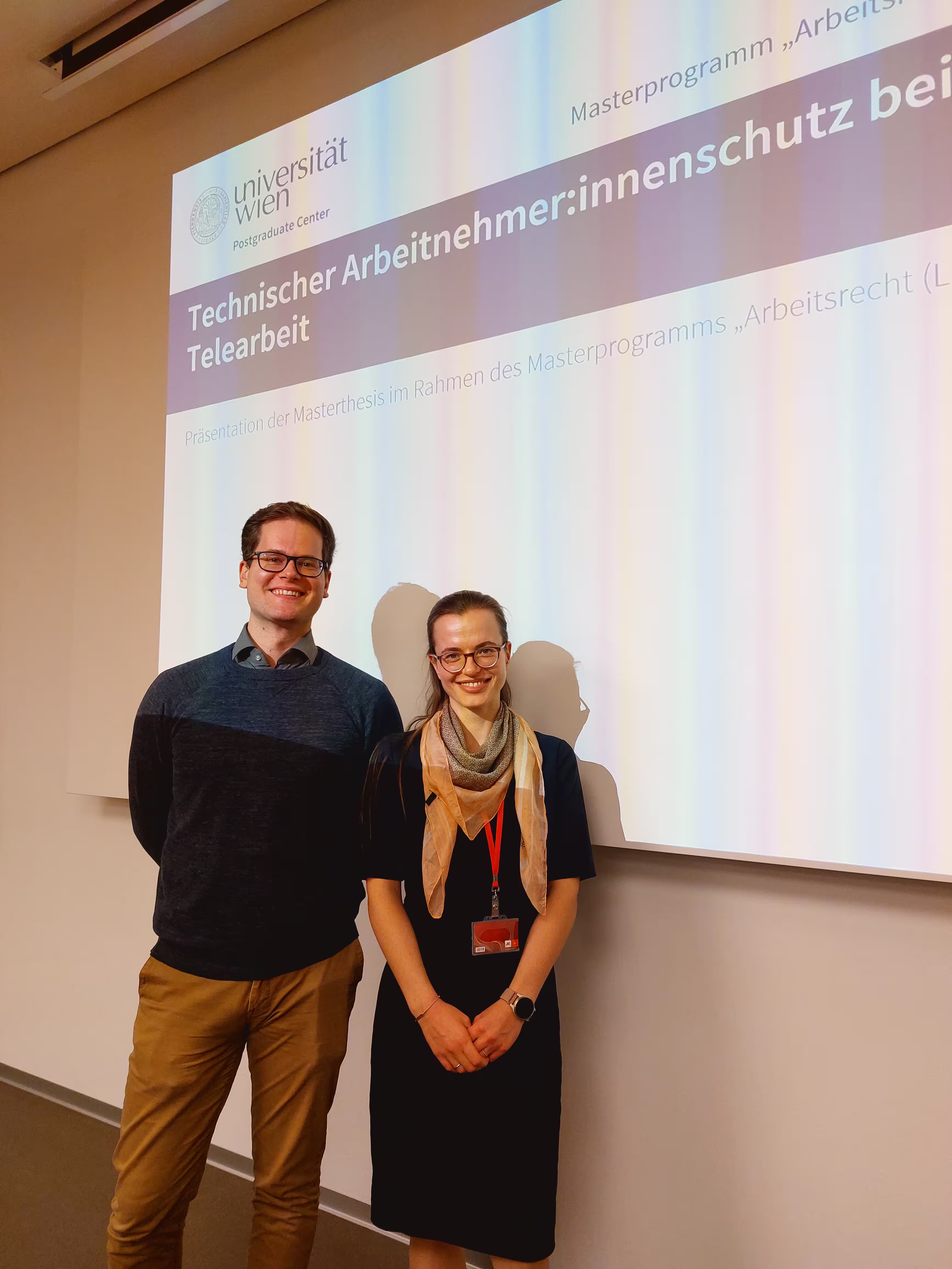 Am Montag, den 13.10.2025, hatten zwei Absolvent*innen des postgradualen Weiterbildungsprogrammes „Arbeitsrecht (LL.M.)“ die Möglichkeit, ihre hervorragenden Masterarbeiten in kurzen Präsentationen vor einem ausgewählten Publikum bei der Arbeiterkammer (AK) Wien vorzustellen und diese auch zu diskutieren. Mag.a Martha M. Harreiter, LL.M. BA und Mag. Nicholas Bellmann, LL.M., referierten über ihre im Sommersemester 2025 geschriebenen Masterarbeiten.